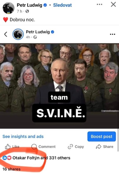 Obrázek zveřejnil Petr Ludwig. Velký obdivovatel těchto metod. Ten správný. Lajkoval Otakar Foltýn námi placený cenzor, manipulátor a lhář. Voják. Proč asi.
