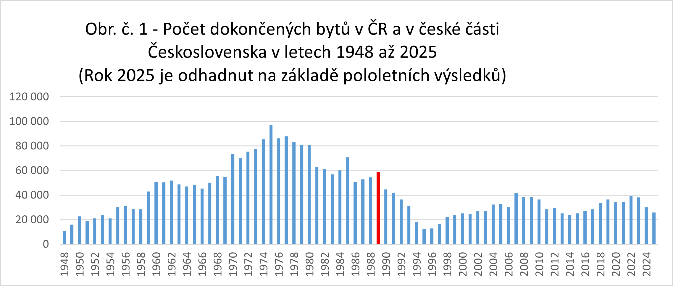 Podívejme se, jak souvisela výstavba bytů s podporou porodnosti. Na grafu níže je zobrazen vývoj počtu dokončených bytů předaných uživatelům.
