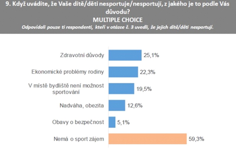 O tom, že výběr sportovního odvětví pro dítě výrazně ovlivňují ekonomické možnosti domácnosti, jsme se už zmiňovali. Vidíme, že k největším překážkám patří zdravotní důvody. Těžko soudit, zda je doopravdy tolik dětí, které by sice chtěli, ale kvůli vážným zdravotním problémům sportovat nemohou, když ano, není to lichotivá skutečnost. Obezita a nadváha ale ve většině případů mezi zdravotní překážky nepatří, jestli obézní děti nesportují, jde patrně hlavně o sociální důvody (aby se ti neobézní neposmívali atd.). Je ale pravdou, že děti s nadváhou, nejsou-li zároveň objektivně nemocní, by právě sportovat měly! A vystoupit ze začarovaného kruhu – jsem obézní, proto nesportuji (třeba proto, že se stydím) – protože nesportuji, nesnižuji pomocí pohybu svoji nadváhu – jsem stále obézní, proto nesportuji, by nemělo být, při dobrém zázemí (rodina, trenéři…) zase až tak moc složité. Jistě, pro některé rodiče může být pohodlnější uspokojit dítě lahodným sladkým nápojem či nějakou smaženou pochutinou než vynakládat úsilí, aby dítě mohlo poznat a prožít i příjemné pocity po sportovním výkonu. Takto pohodlně vyrůstající dítě bude v dospělosti dříve a více nemocné, než jeho sportující vrstevníci. Osobně těmto rodičům nerozumím, vždyť zdraví a štěstí potomků by mělo být přirozenou rodičovskou snahou.