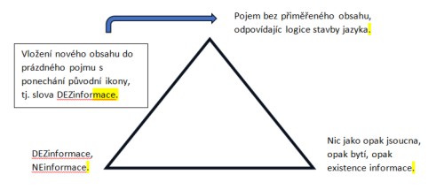 Pojem neinformace, viz náš sémiotický trojúhelník, není možné stanovit. Ikona, to je samotný pojem neinformace, nebo s příponou pro cizí slova dezinformace nemá svůj obsah. Jinak řečeno obsah pro slovo dezinformace je prázdný a tím pádem i volný. Prázdnotu ikony využili pracovníci NKVD a následně byl tento pojem převzat britskou encyklopedií. Byl mu vložen obsah, který vyjadřuje činnost vypuštění falešné informace, která neodpovídá skutečnosti, za účelem vytvoření dezorientace ve skutečnosti. Tato dezorientace lidí, které má falešná informace ovlivnit, poskytuje tomu, kdo podvrh vypustil, výhodu. Ekonomickou, mocenskou, ideologickou a zejména vojenskou. Není nic lepšího pro armádu, než vysláním falešné informace přinutit protivníka přemístit vojenské síly tam, kde se nebude odehrávat skutečná obranná, nebo útočná operace. Pokud protivník podlehne informaci, která ho uvede v omyl, dojde ke změně poměru sil na bojišti, kde dojde ke střetu. Úkolem vojenských zpravodajců je shromažďovat věrohodné informace o skutečné situaci na bojišti, vylučovat falešné informace, a ještě podvrhovat protivníkovi vlastní zavádějící informace. Tady někde došlo k chybné asociaci páru slov orientace/dezorientace v jiný pár slov informace a dezinformace. Tvůrce slova si neuvědomil, že pojmově volnou ikonu dezinformace nelze použít k vytvoření pojmu vyjadřující úsilí o dezorientaci protivníka v informacích. Slovo dezinformace se velmi podobalo slovu dezorientace, a tak bylo použito pro pojmenování podvržení falešné informace protivníkovi.