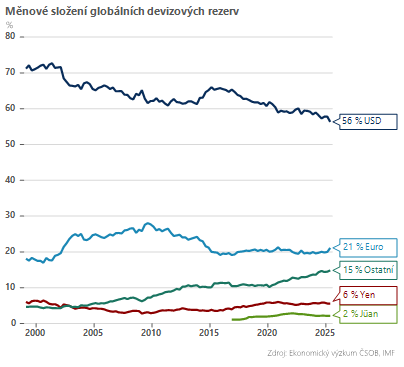 Pojďme od teorie k praxi. Jak vypadají konkrétní čísla? Podíl dolaru na globálních měnových rezervách (bez zlata) klesl ze 70 % na přelomu milénia na aktuálních 56 %. Kdo jsou jeho vyzyvatelé? Euro dlouhodobě stagnuje okolo 20% podílu, avšak eurozóna je institucionálně nedovařený projekt – chybí společná fiskální politika i dluh jako alternativa bezrizikového aktiva k americkým vládním dluhopisům. A co Čína? Jüan má podíl pouhá 2 %, ale hlavně přísné kapitálové kontroly, což ho automaticky vylučuje z tohoto klání.