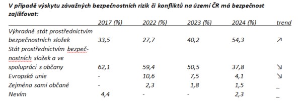Zdroje dat: Středisko analýz a empirických průzkumů Sanep, s.r.o.; průzkumy na téma Bezpečnostní situace v ČR, reakce na krizové situace, branná výchova. Reprezentativní vzorky dotázaných respondentů 18+ (1917 – 16 371; 2022 – 36 567; 2023 – 27 651; 2024 – 2 450) odpovídali sociodemografickému rozložení obyvatel ČR dle údajů ČSÚ, statistická odchylka ±1,5 %.