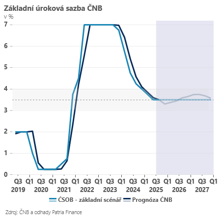 Nová prognóza ČNB i její interpretace na setkání s analytiky na nás působí lehce jestřábím dojmem.Pravděpodobnost dlouhodobé stability sazeb (což je náš základní scénář) po jejím uveřejnění v našich očích vzrostla. Hlavní zprávou je, že přes revizi hospodářského růstu i inflaci směrem lehce dolů a souběžnému posílení výhledu pro korunu, vidíme i tak prognózu ukazující v základním scénáři na vyšší úrokové sazby než v letních měsících - po stabilitě sazeb v příštím roce ukazuje spíš na možnost jejich lehkého růstu v roce 2027.