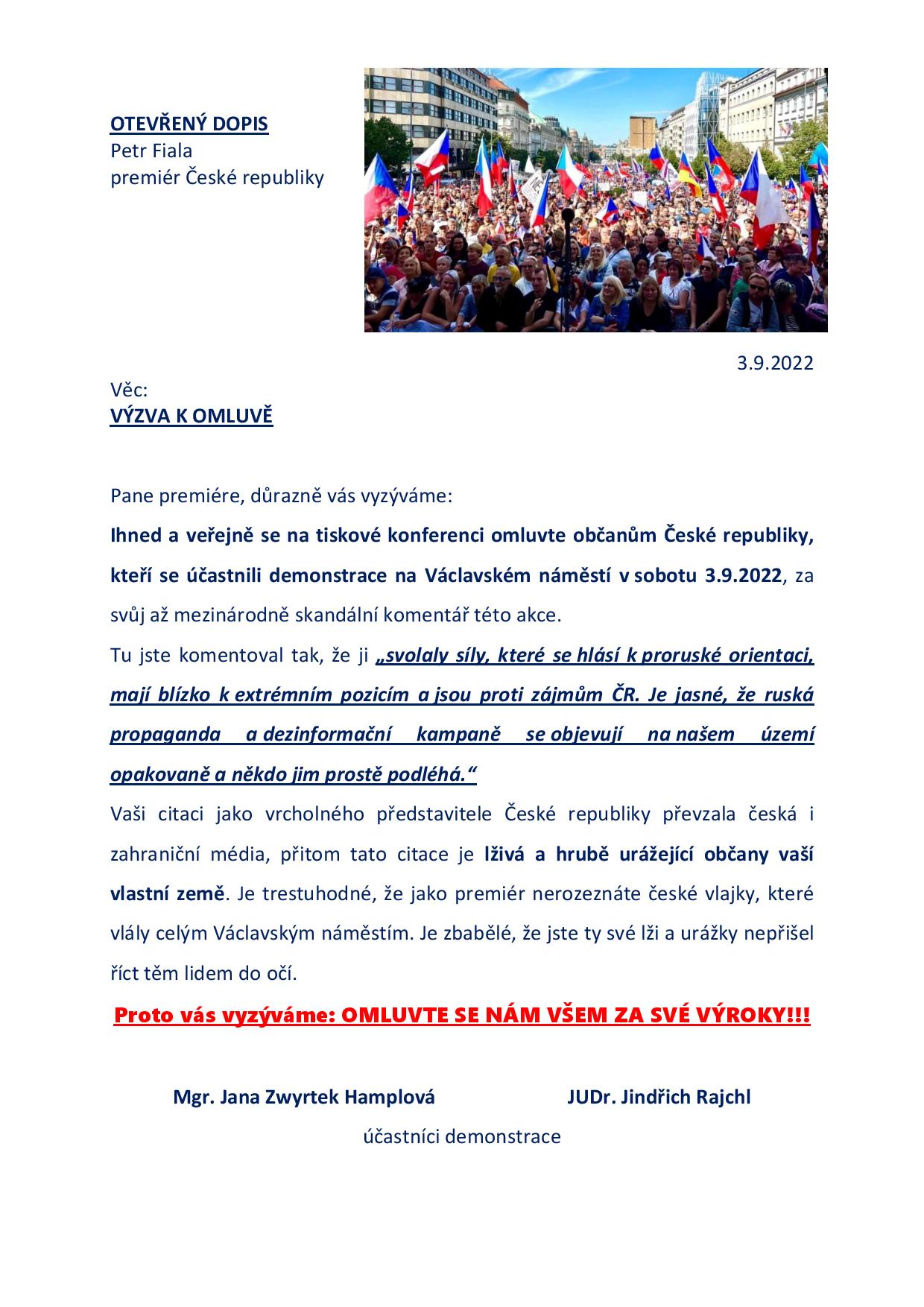 Proto jsme sepsali otevřený dopis - výzvu k omluvě, kterou dnes Petrovi Fialovi odešleme.