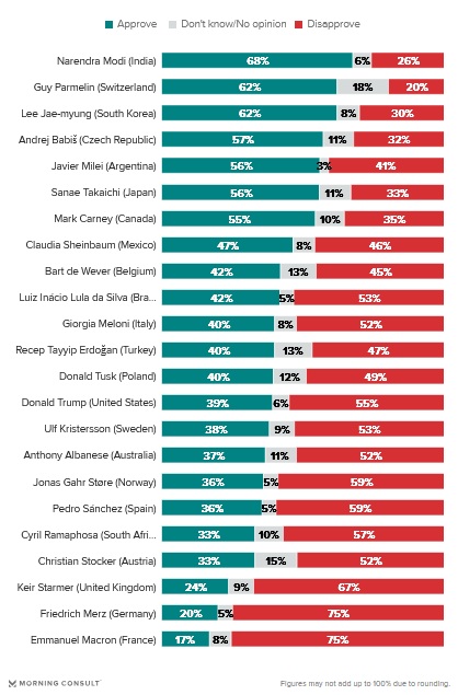 Výsledky globálního průzkumu Morning Consult současně ukazují, že důvěra v politické lídry je ve světě velmi proměnlivá a mnozí státníci čelí výraznému poklesu podpory. V tomto kontextu působí stabilní a relativně vysoké hodnocení českého premiéra jako výrazný kontrast k trendu, který je patrný v řadě evropských zemí.