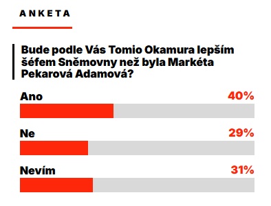 První zprávy zveřejnily výsledky čtenářské ankety k otázce, zda bude Tomio Okamura lepším předsedou Poslanecké sněmovny než jeho předchůdkyně Markéta Pekarová Adamová z TOP 09. Hlasování probíhalo od 5. do 8. listopadu 2025 a zapojilo se do něj celkem 24 134 respondentů. Největší podíl získala odpověď „Ano“ se čtyřiceti procenty hlasů. Možnost „Ne“ vybralo dvacet devět procent účastníků a odpověď „Nevím“ uvedlo třicet jedna procent. V přepočtu na počty hlasů to odpovídá zhruba 9 654 hlasům pro „Ano“, 6 999 pro „Ne“ a 7 481 pro „Nevím“.