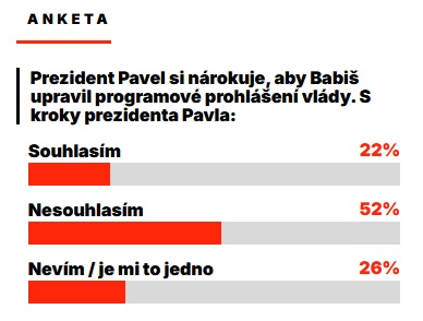 Nesouhlas s prezidentem vyjádřilo 52 procent respondentů. Více než polovina veřejnosti tak odmítá, aby prezident zasahoval do tvorby vládního programu. Podle mnoha komentářů mohou lidé vnímat podobné kroky jako narušení ústavní rovnováhy nebo změnu tradičně umírněné role prezidenta v českém politickém systému. V období, kdy se formuje nová vláda, takový požadavek podle části veřejnosti působí přehnaně nebo dokonce nepatřičně.